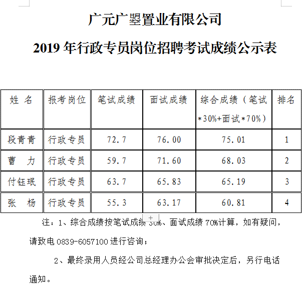廣元廣曌置業(yè)有限公司2019年行政專員崗位招聘考試成績(jī)公示表