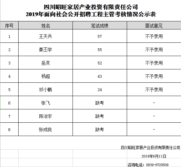 四川昭旺家居產業投資有限責任公司2019年面向社會公開招聘工程主管考核情況公示表
