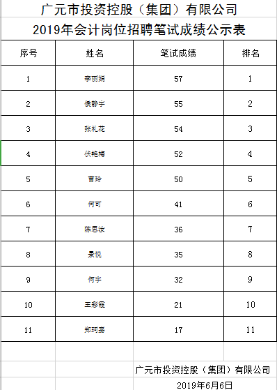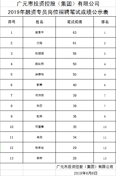 廣元市投資控股(集團(tuán))有限公司關(guān)于公開(kāi)招聘工作人員的筆試成績(jī)公示表