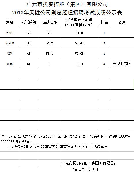 廣元市投資控股(集團)有限公司2018年天健公司副總經(jīng)理招聘考試成績公示表